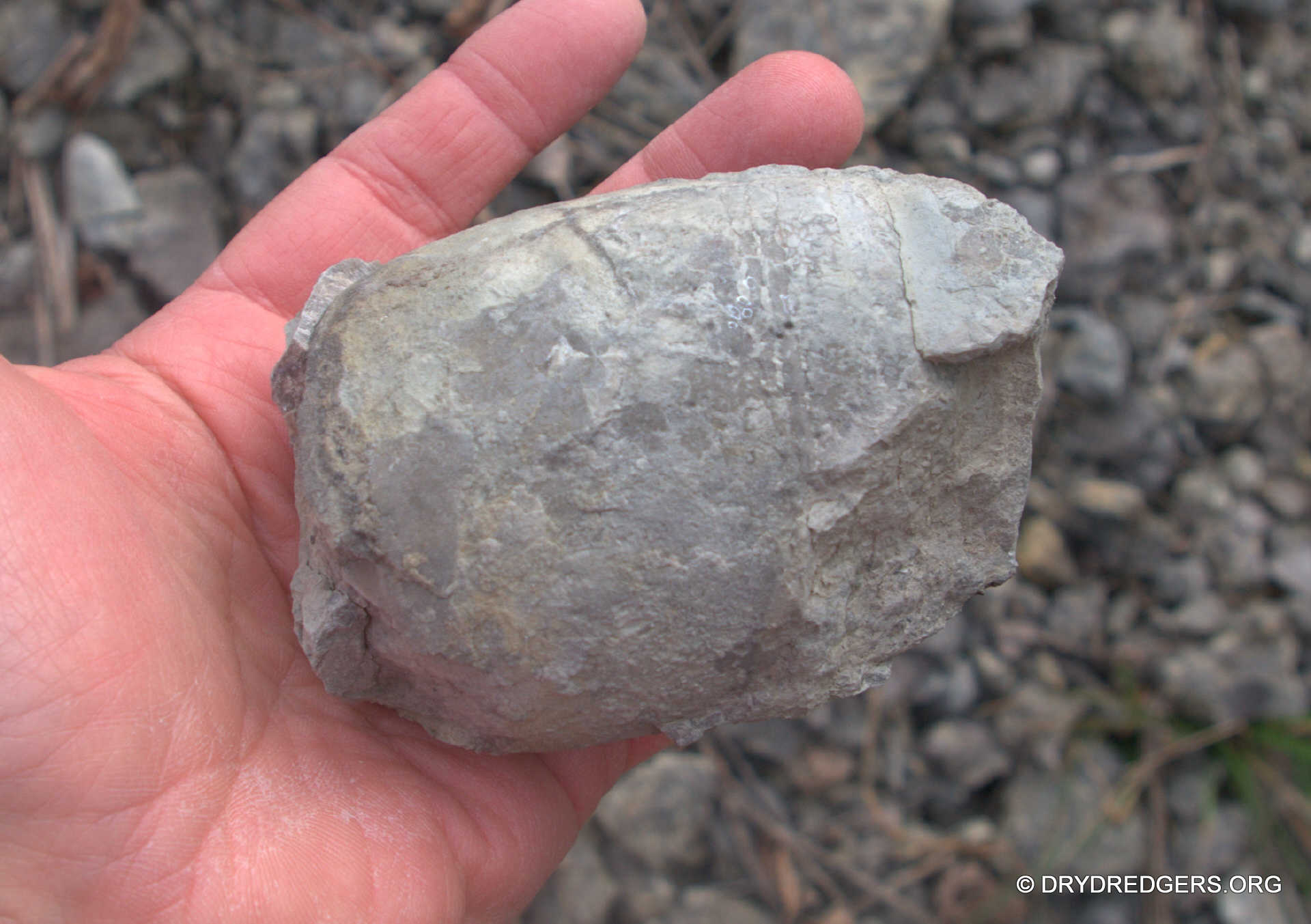 The most common articulate brachiopod found that day was Vinlandostrophia sp..(formerly Platystrophia sp.) At first, we were finding pieces of them, often hard to identify on the rock surfaces (next photo).