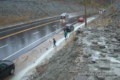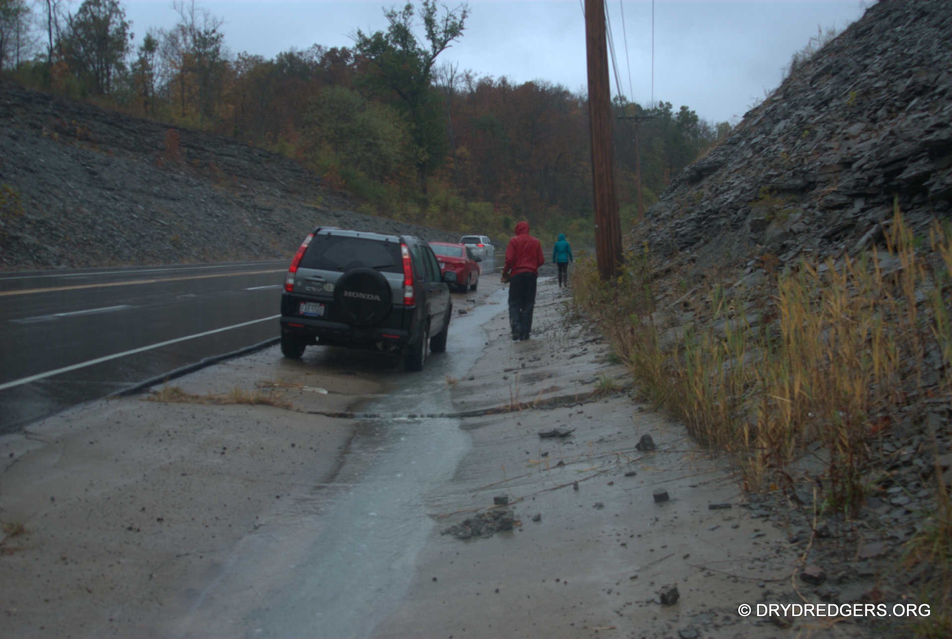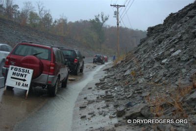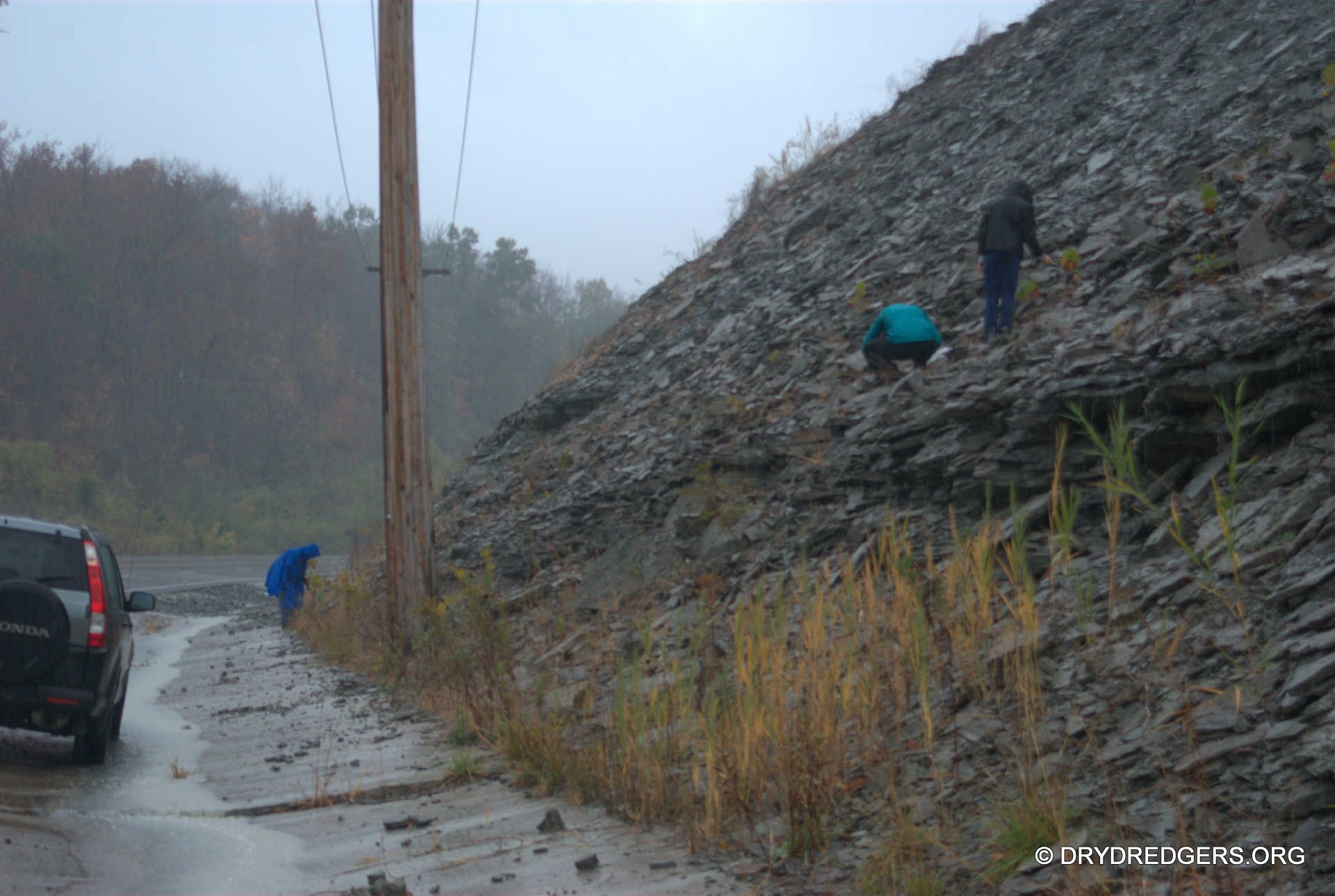 It was a medium rain until noon. Everyone collected fossils in the rain. We found some nice fossils, including some nice cephalopods. Perhaps the real story is that 9 people came to this field trip despite the fact that it was raining since dawn and forecasted to get up to 2 inches. The attending, which included new members, were not willing to give up the last fossil hunt of 2019 because of a little rain. One member drove down from Columbus. My highest commendations go out to these intrepid Dry Dredgers!