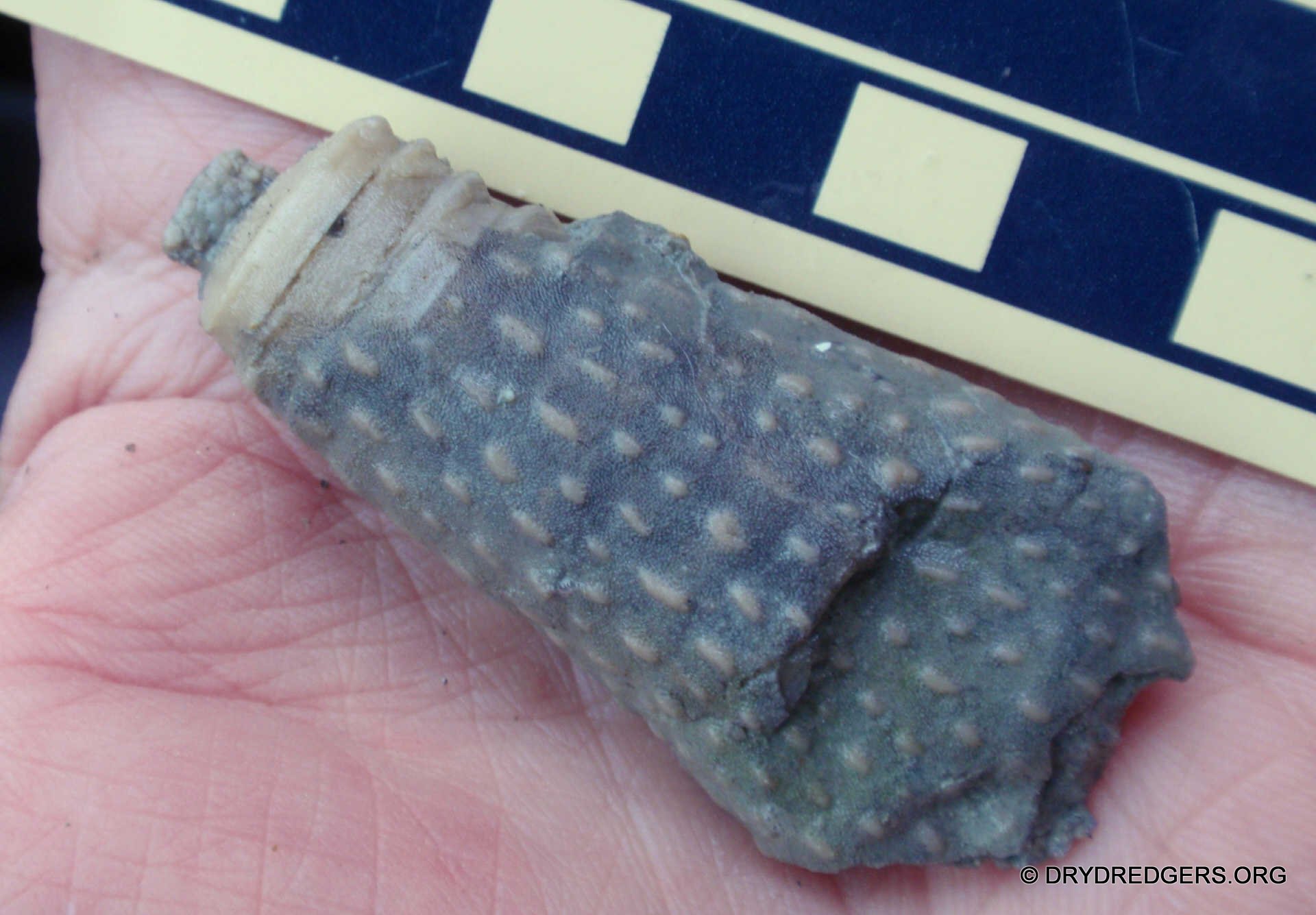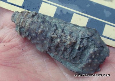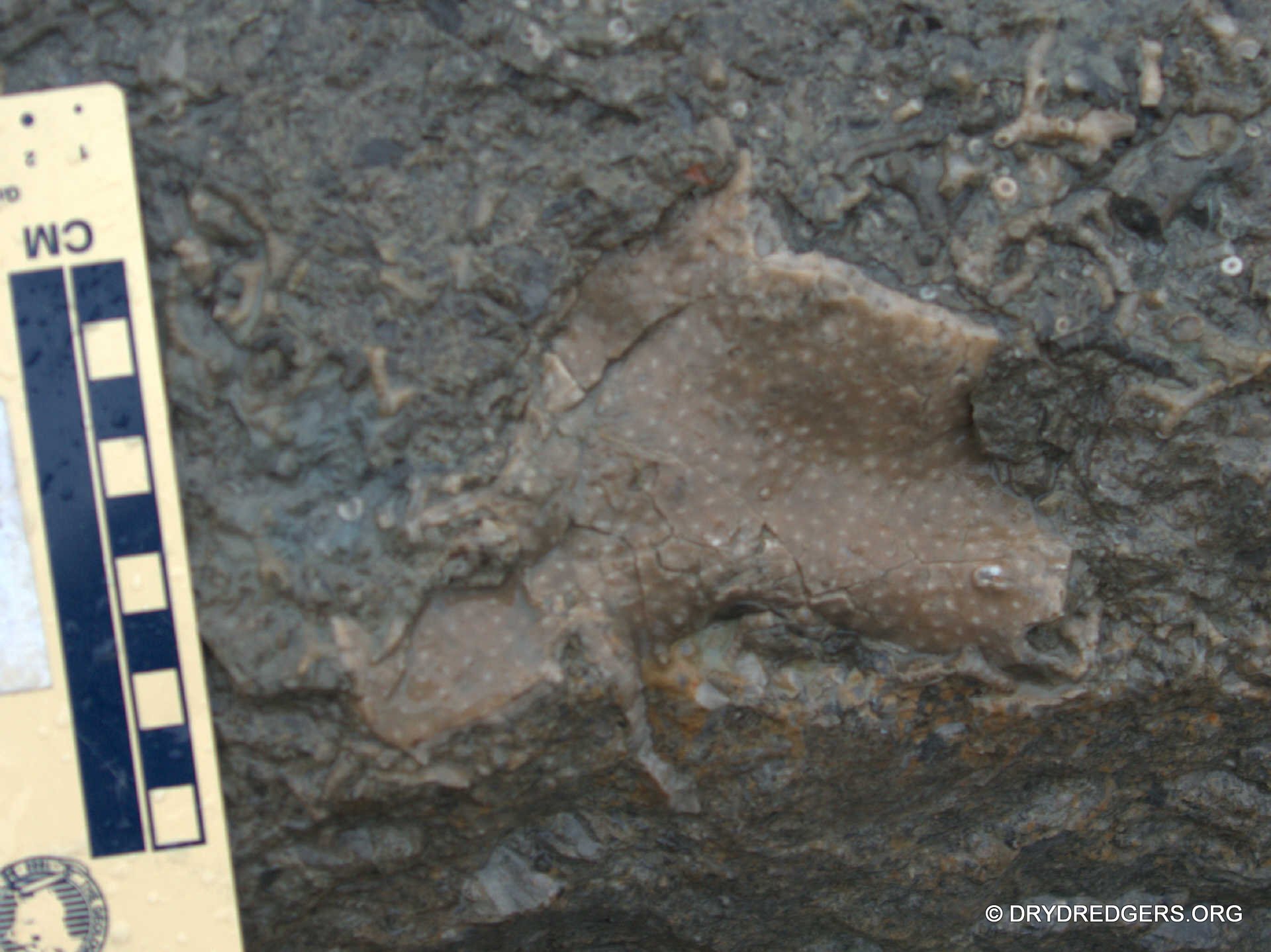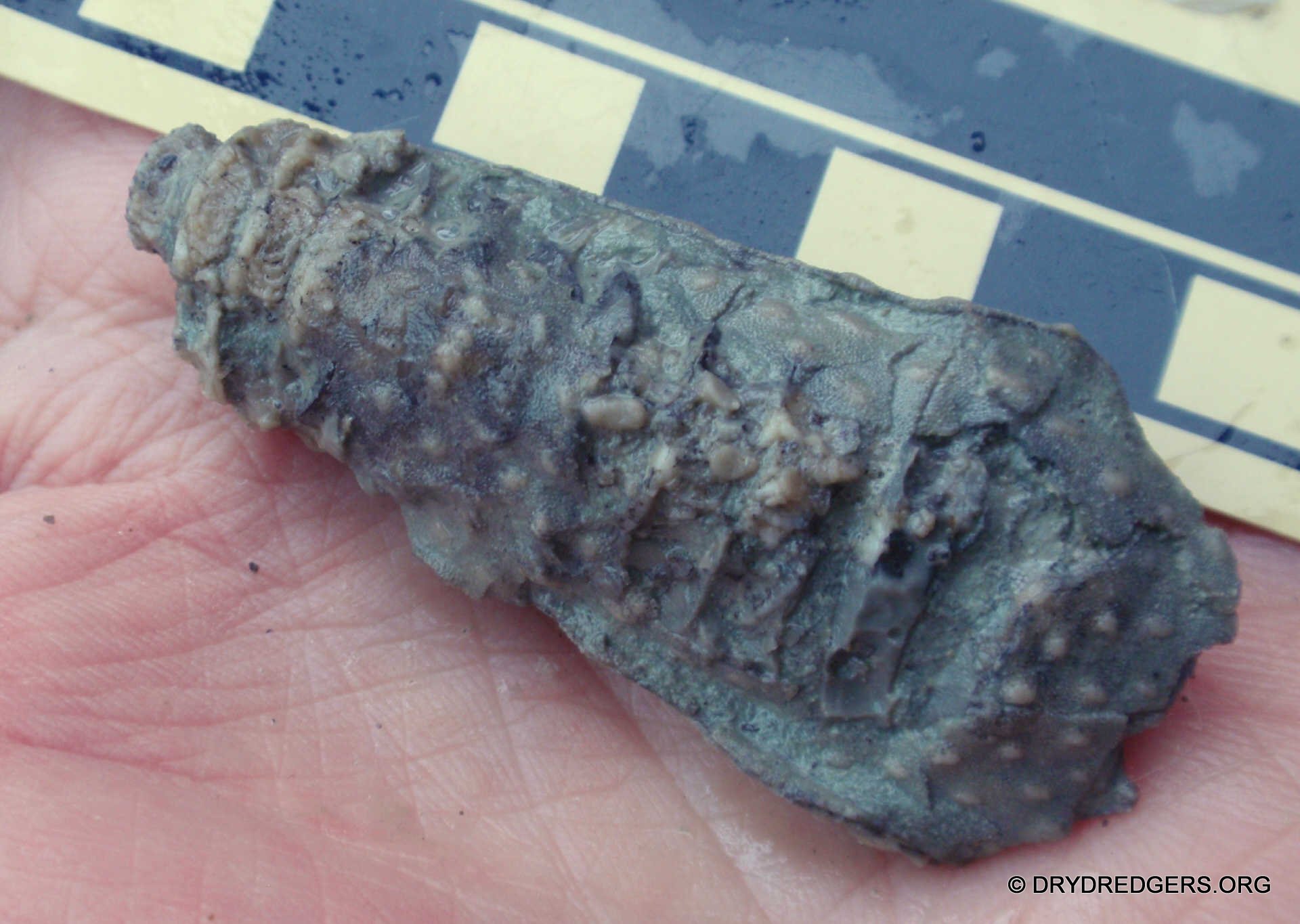 Here’s a nice find. This straight-shelled nautiloid had the orthocone chambers preserved in brown calcite with the siphuncle visible. The shell was encrusted with the interesting bryozoan, Spatiopora sp.