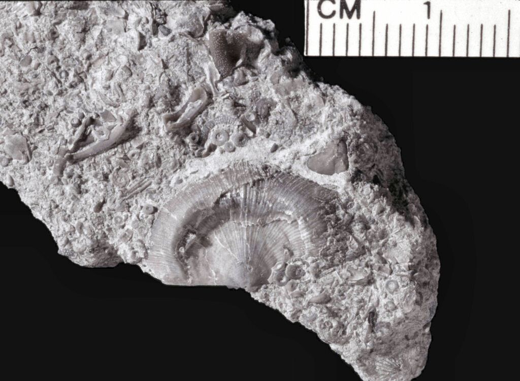 Found in the RichmondianMid-size brachiopod, rectangular in shape. It is distinguished by four strong wrinkle-like growth lines in the dorsal valve that begin and end at the hinge line but curve parallel to the hinge line as they move away from it. On larger shells, there can be an abrupt curving of the valves toward the margin with the brachial valve convex and pedicle concave.