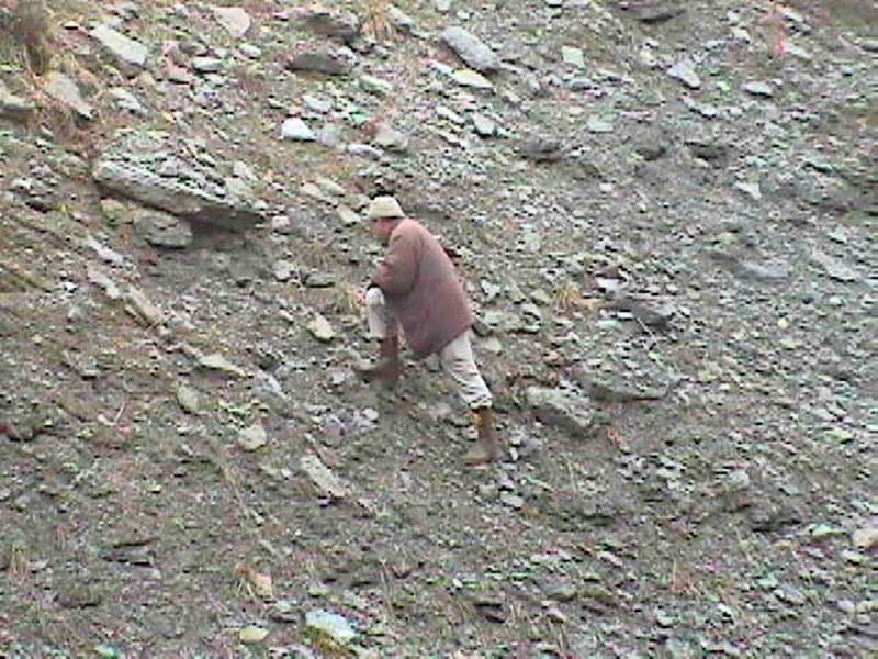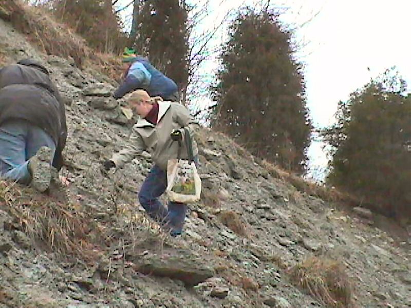 The collectors were mostly checking the middle layers, which had lots of "fall down" material from the layers at top mixed in. The rewards with this approach, they hoped, would be trilobites and Conularia, both of which were known to be found in these layers. Today, those efforts paid off for many Dredgers.