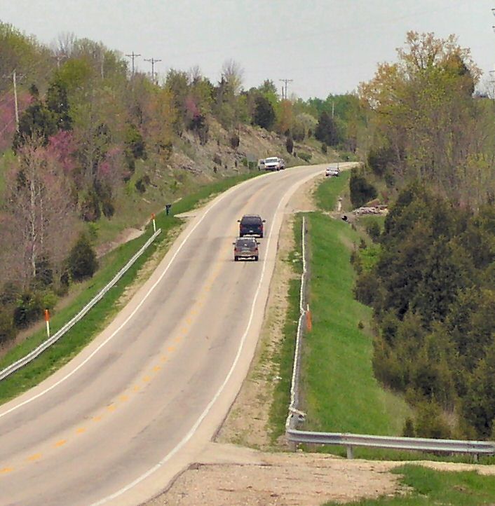 At the far end, the road cut has a large exposure of