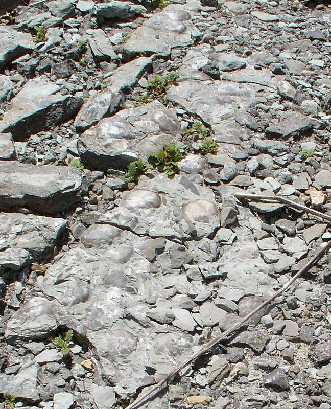 whole ones, often sticking up partially from under the dirt and shale.