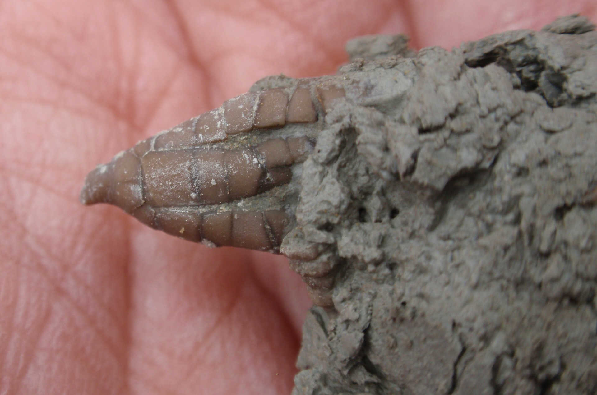 The April field trip was to a site that we like to hit in the spring, when the freezes and thaws of winter have broken rocks and washed away the gray Ordovician clay leaving the heavier carbonate fossils behind. The site is just a short drive from downtown Cincinnati. It exposes the Southgate member of the Latonia (Kope) Formation.