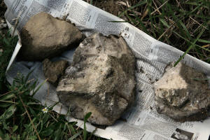 The first site exposes the Bardstown member of the Drakes formation, which is upper Ordovician. Here we found lots of corals. We also found a few stromatoporoids. Most of the large coral heads were sitting loose waiting to be picked up. Others were acquired by "popping" them out of the hill side.