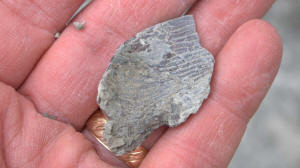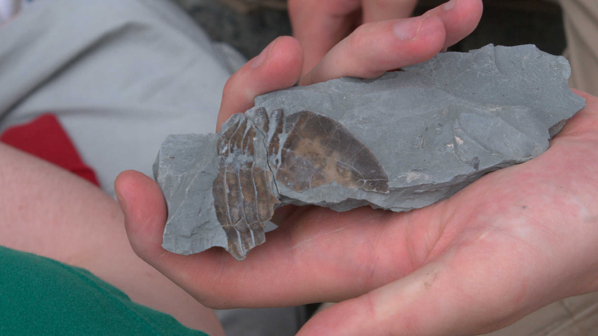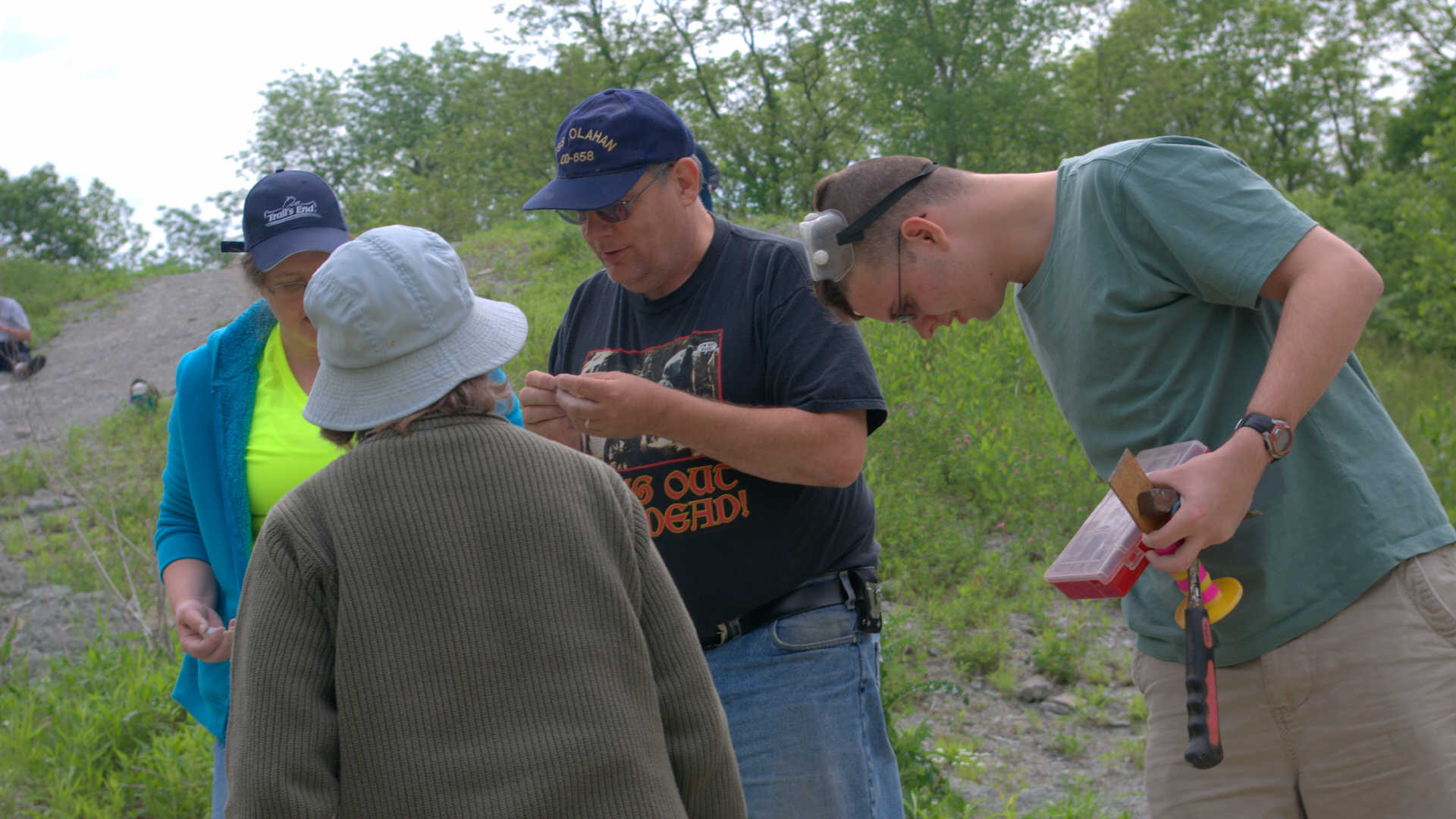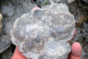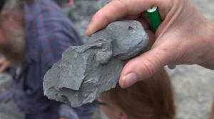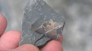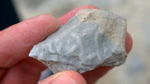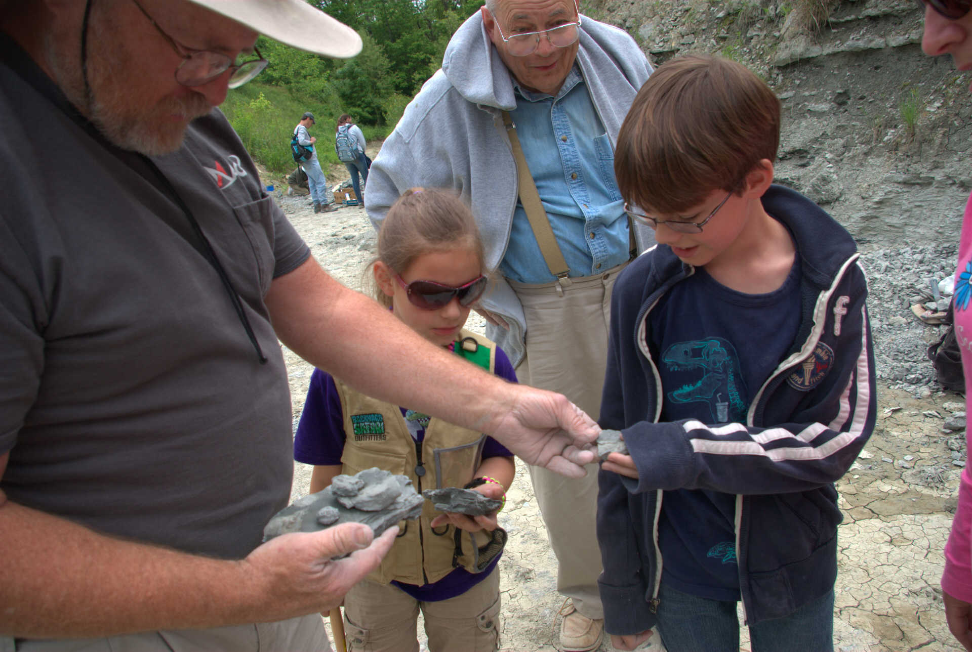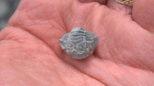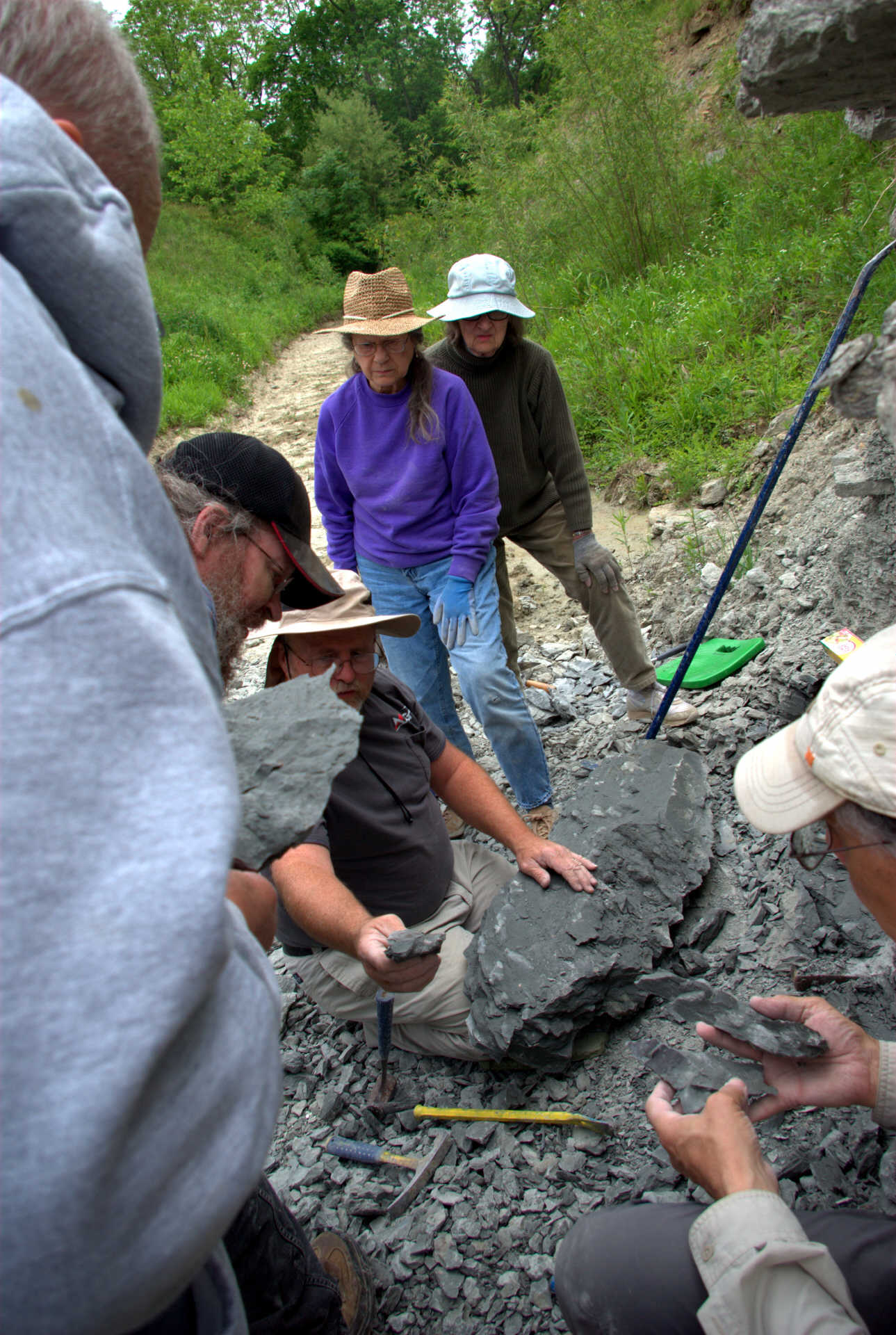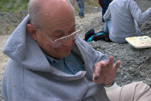 While waiting at the designated meeting place, members show off their fossil finds and share collecting information.