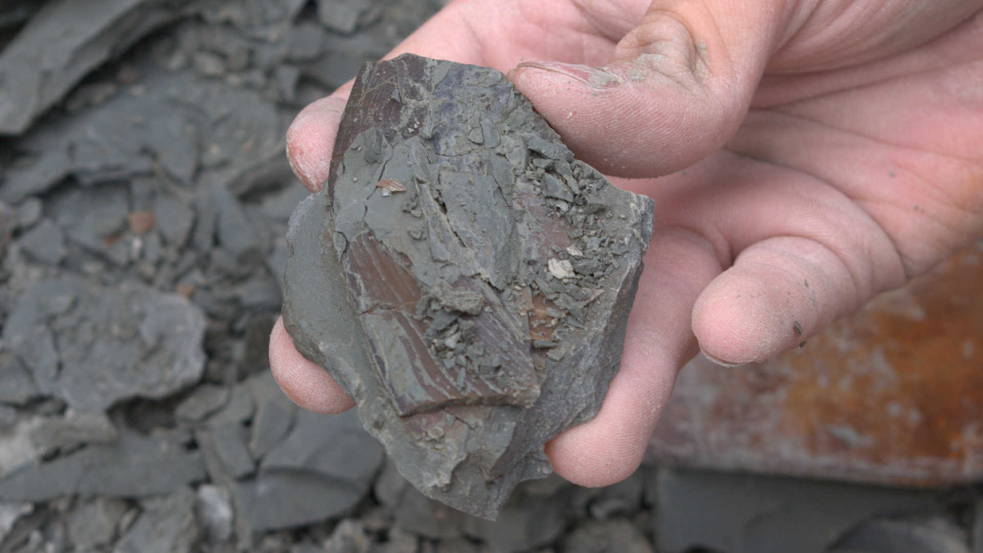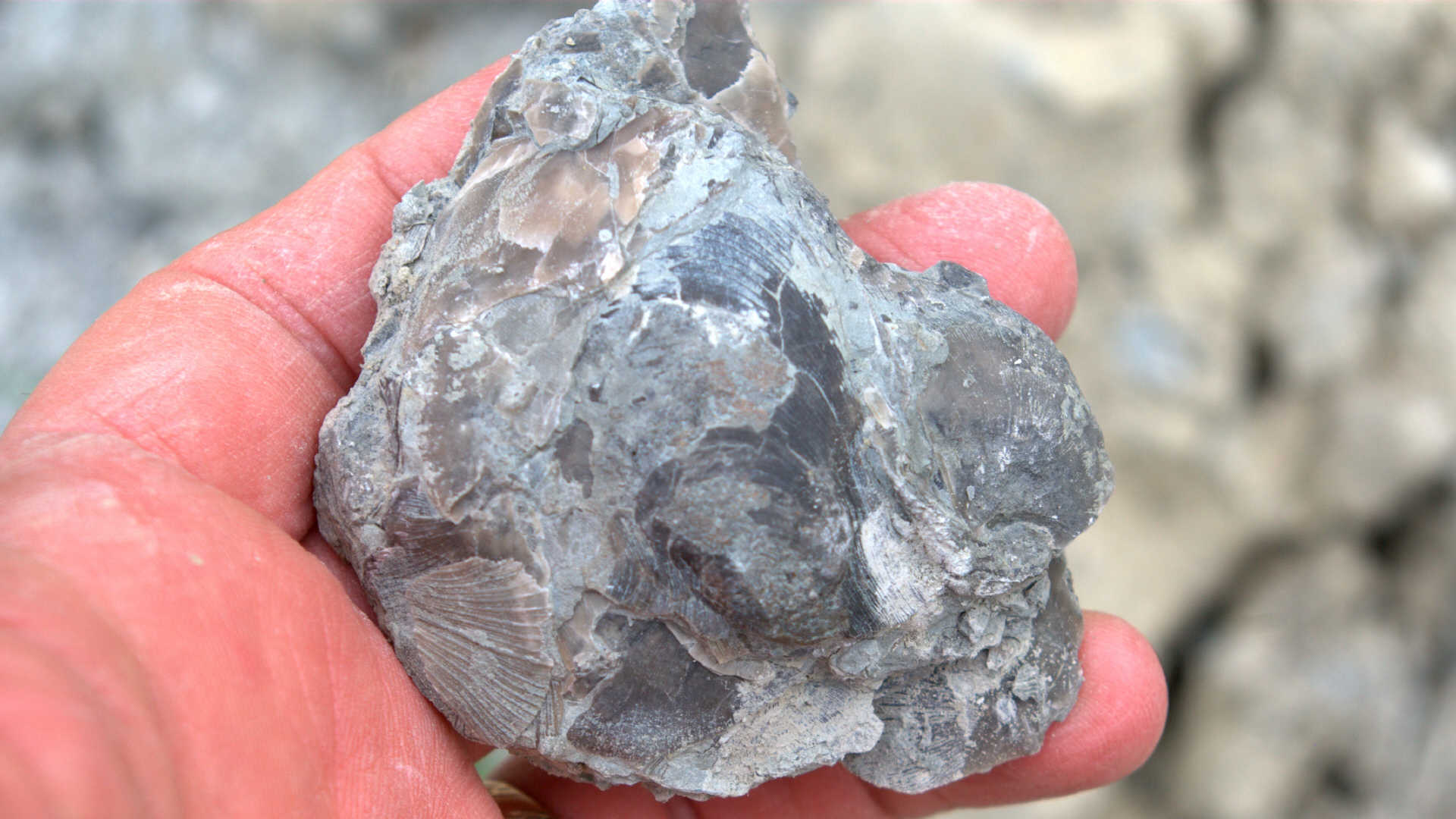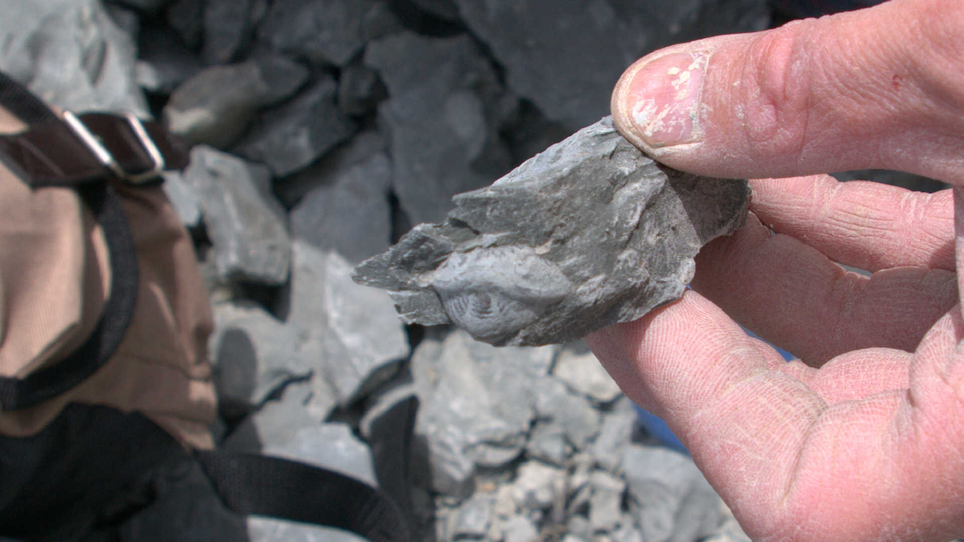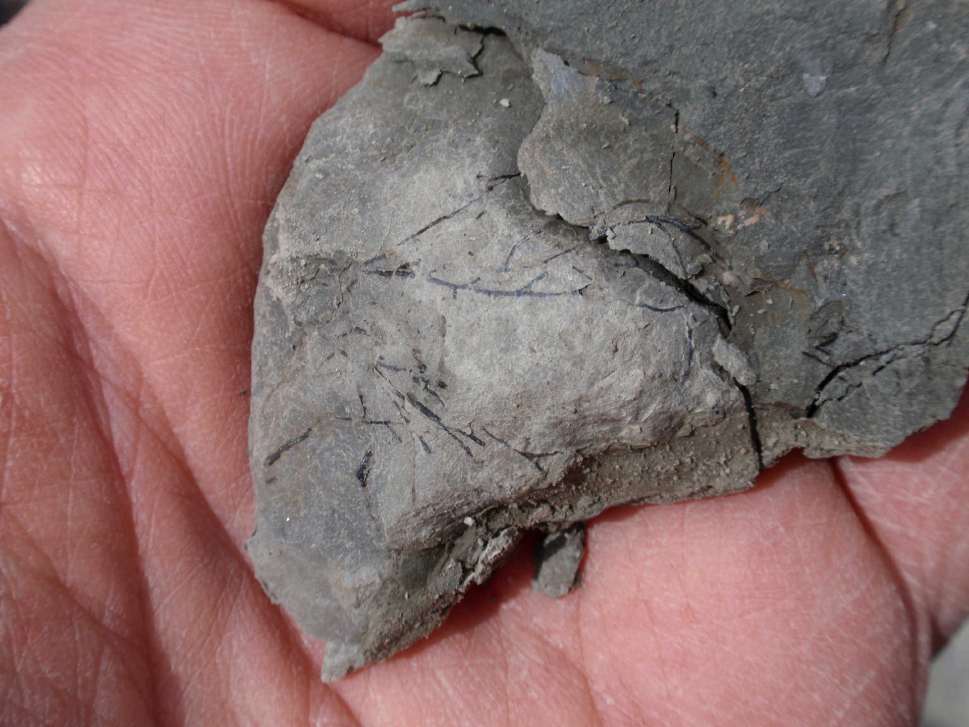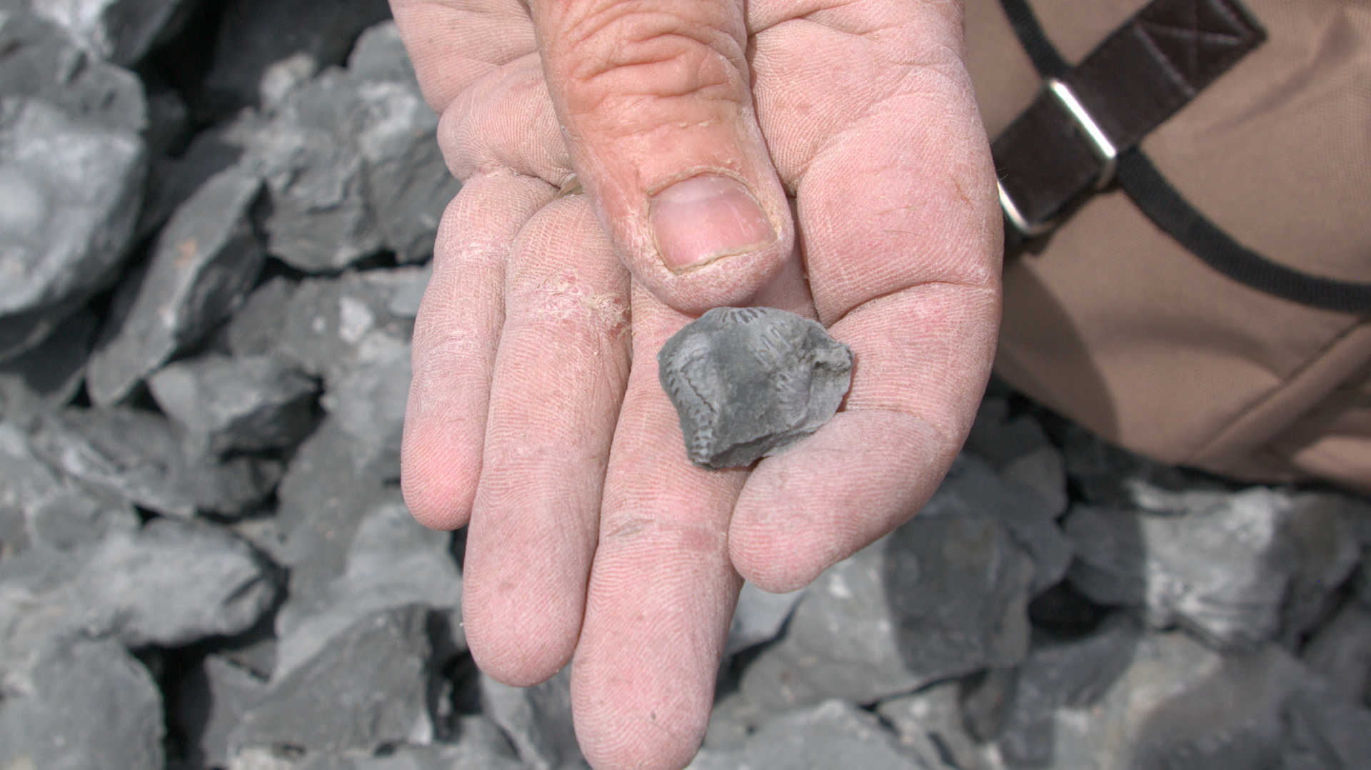 While waiting at the designated meeting place, members show off their fossil finds and share collecting information.