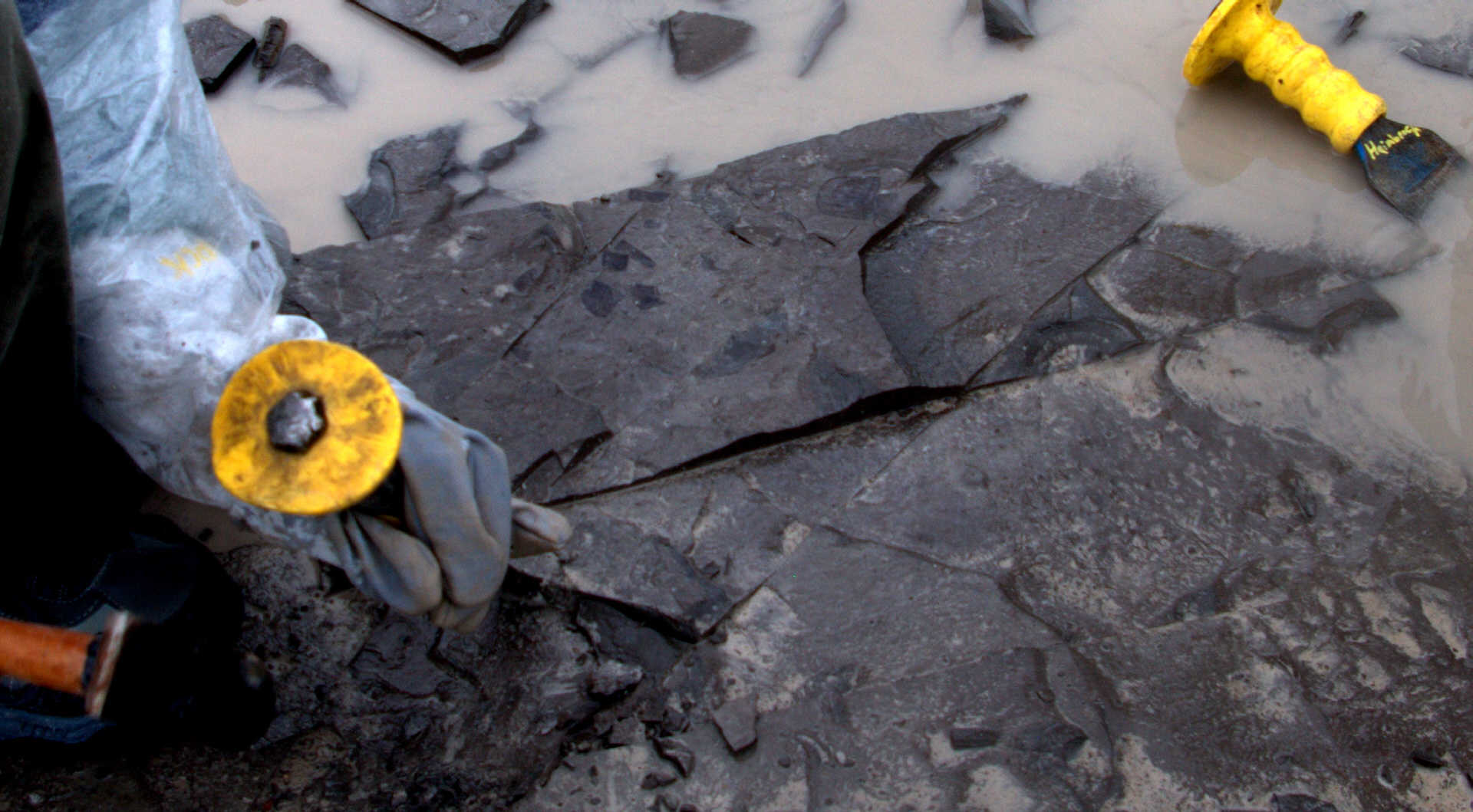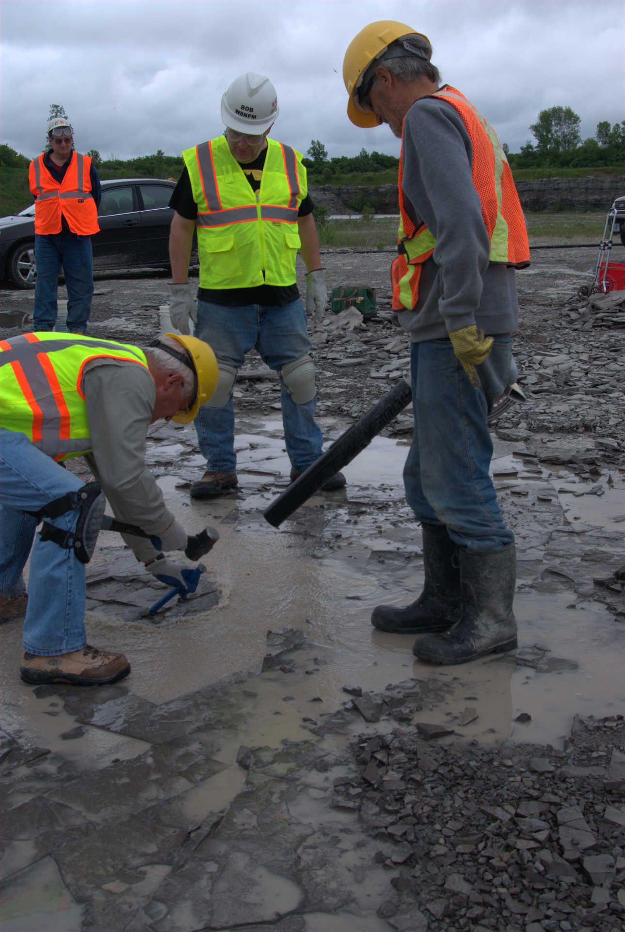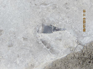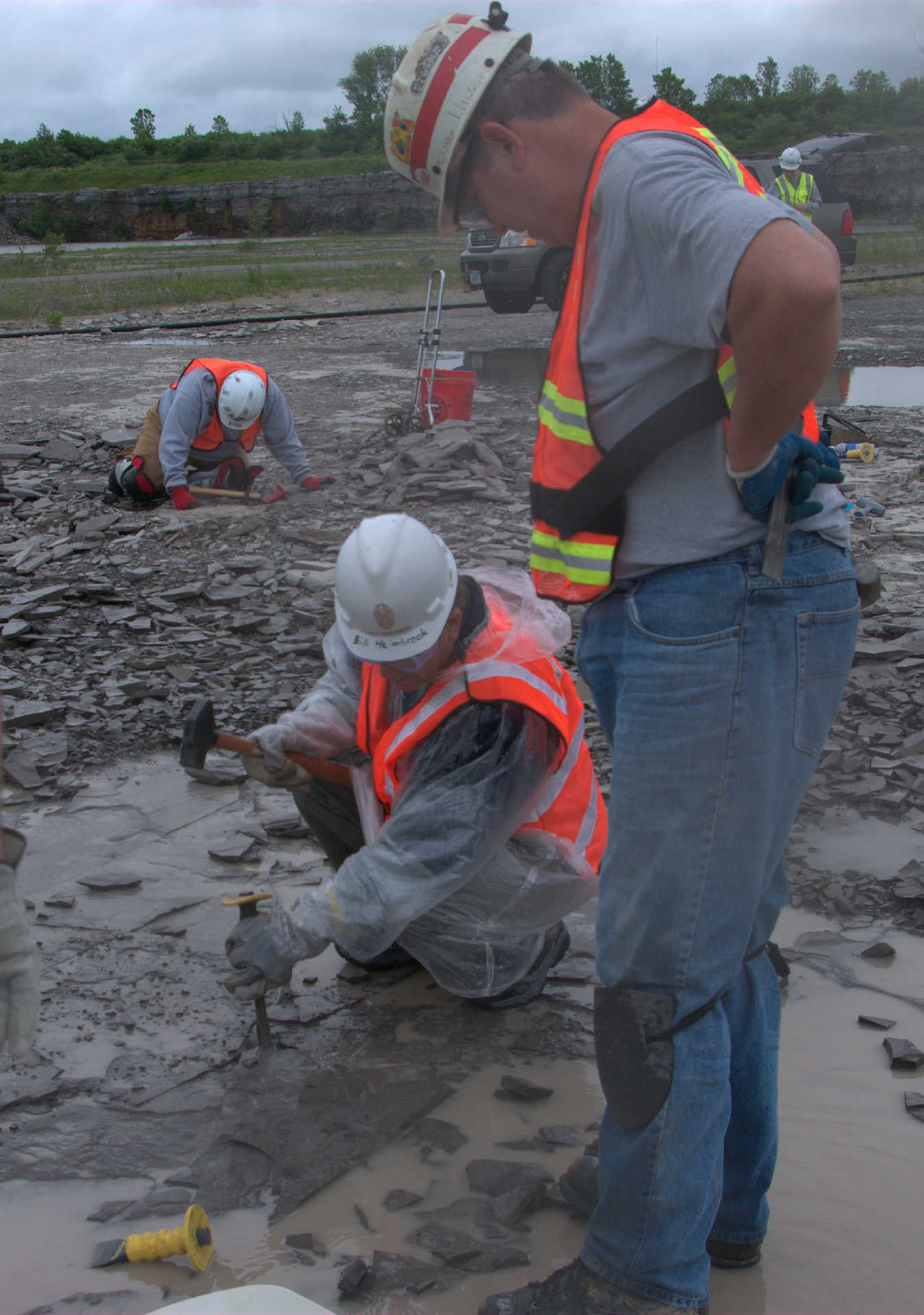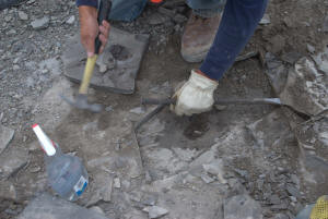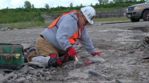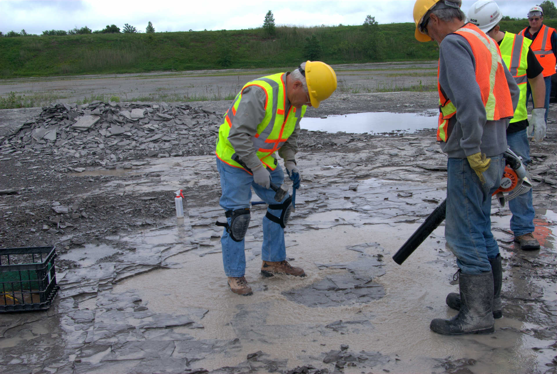 Malcolm was also a really big help in uncovering at least 5 Eurypterid heads the previous week and leaving them for us to dig out. He did not count on it raining and the ditches filling with water. So he brought is leaf blower, which worked excellently for temporarily dispersing the water while we dig. Malcolm was patient and held the leaf blower until we had all 5 heads extracted. He advised us along the way as to where is best to break the shale and which tool to use. Here are ome photos of the Eurypterid heads and their extractions.