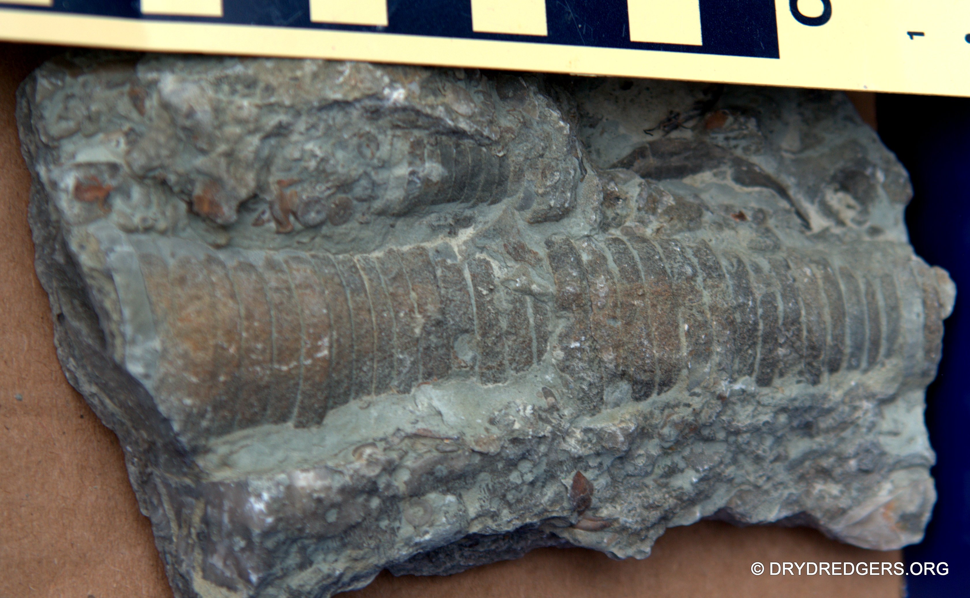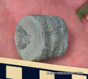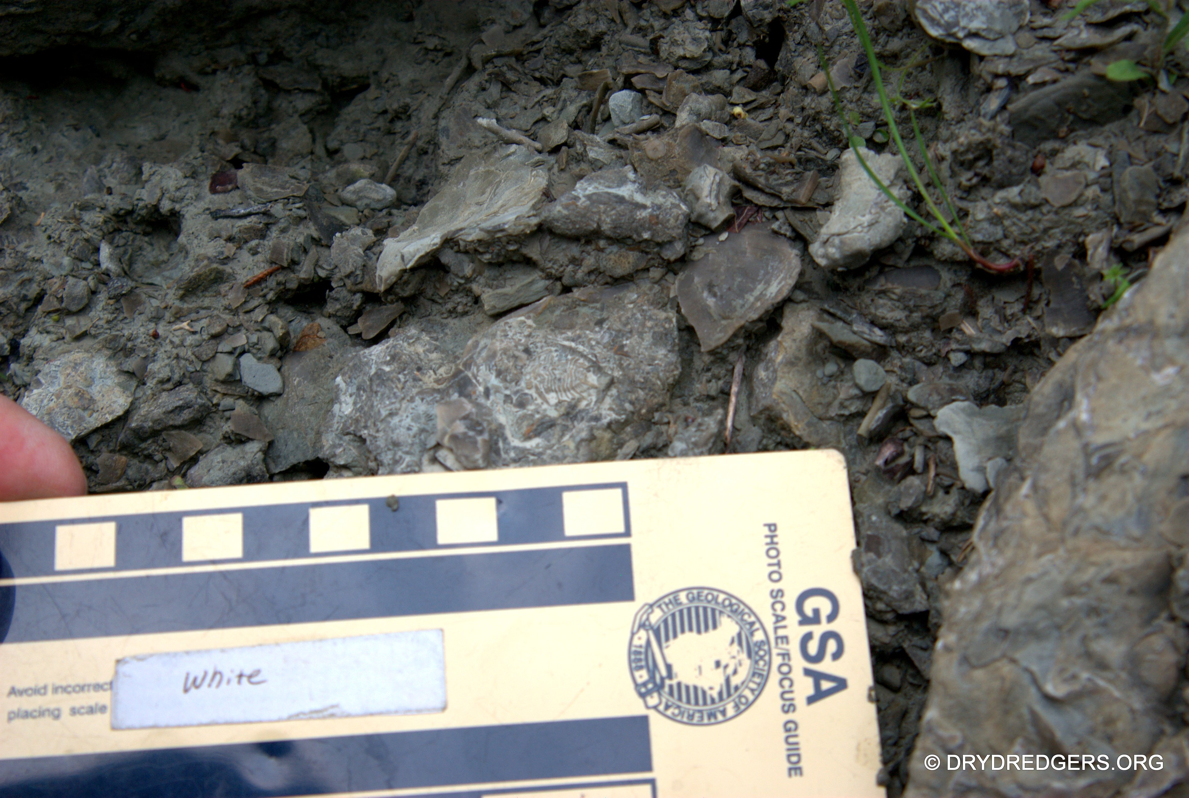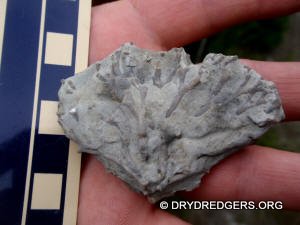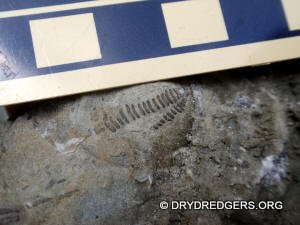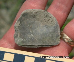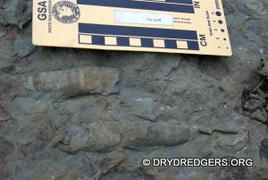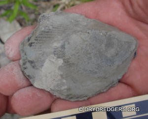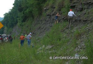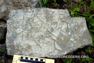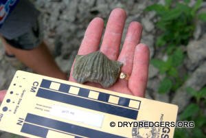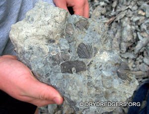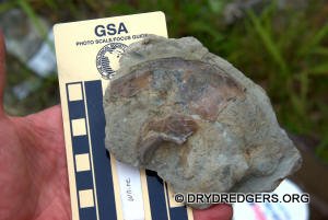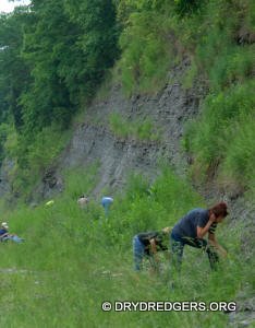 The Ohio site we code named "Ponderosa Ranch" was not flooded. It had been a popular site in past years for finding the large brachiopods Vinlandostrophia (Platystrophia) ponderosa and Rafinesquina ponderosa. The site exposes the Bellevue Formation of the Cincinnatian Series. These rocks and fossils are from the Late Ordovician Period and are about 445 million years old.