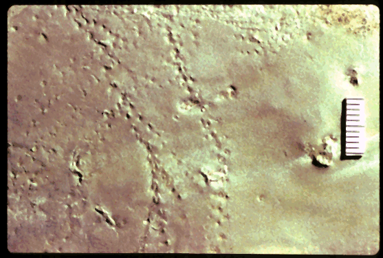 These trace fossils are harder to identify as caused by Flexicalymene, but they are arthropod tracks probably made by a trilobite. It may have been a Flexicalymene, inferred roughly from the track spread. The scale is in millimeters.