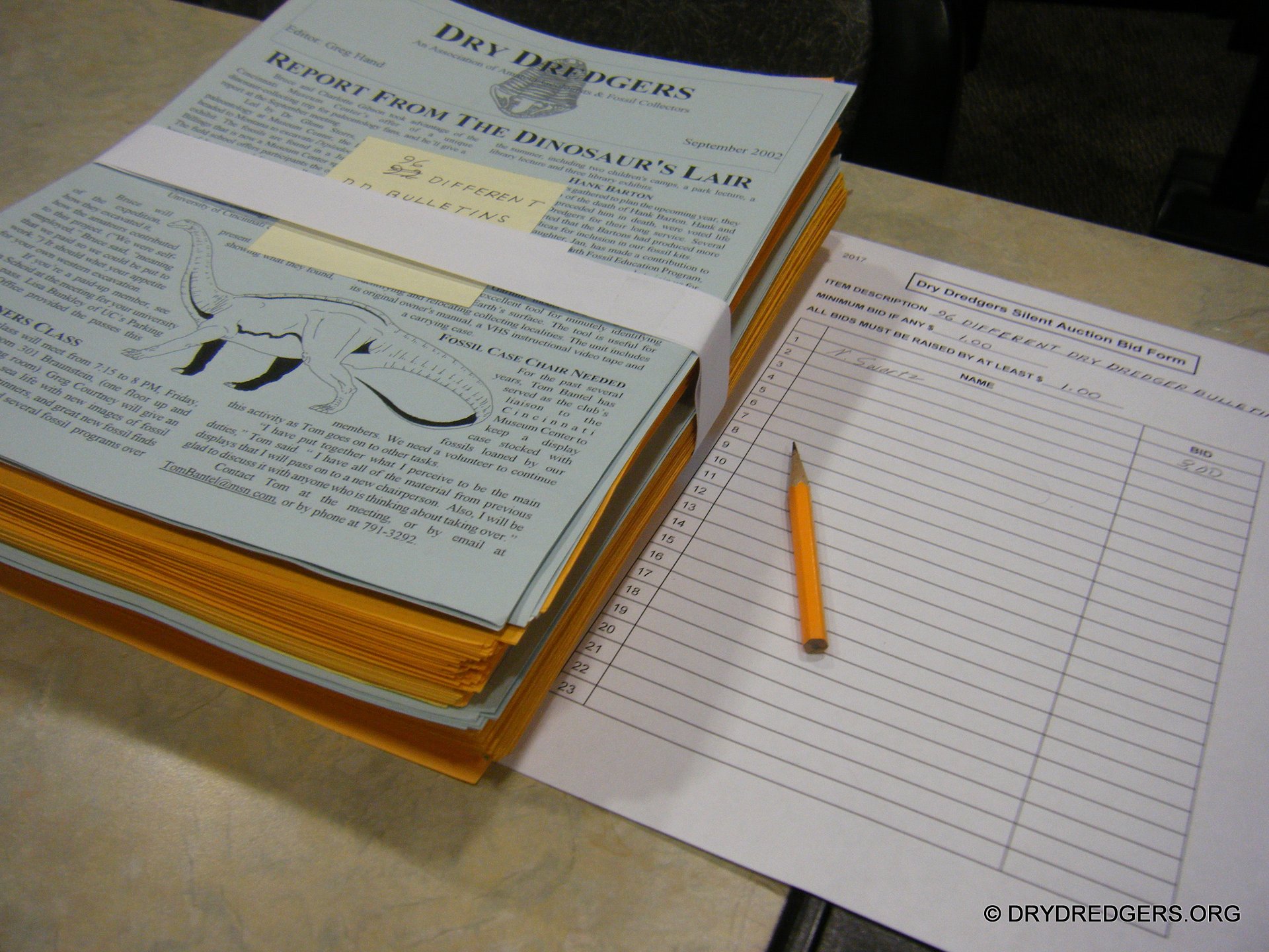 Thanks to all who donated items and who bid on the items. All income benefits the Dry Dredgers, which in turn, benefits the study of Paleontology through the Paletontological Research Award and education of the public through donations to schools and institutions and other outreach.